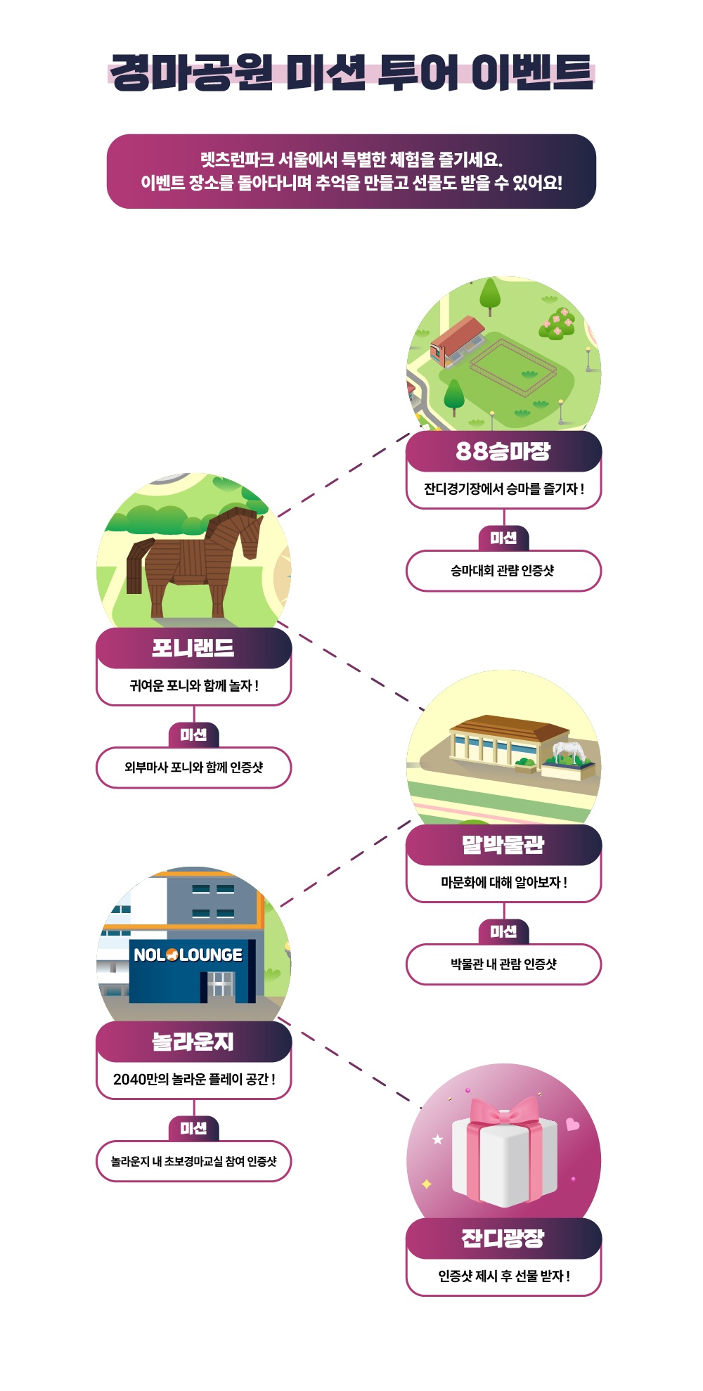- 참가자는 88 승마장, 포니랜드, 말박물관, 놀라운지의 미션을 모두 완료하고 인증샷을 찍어야 합니다.