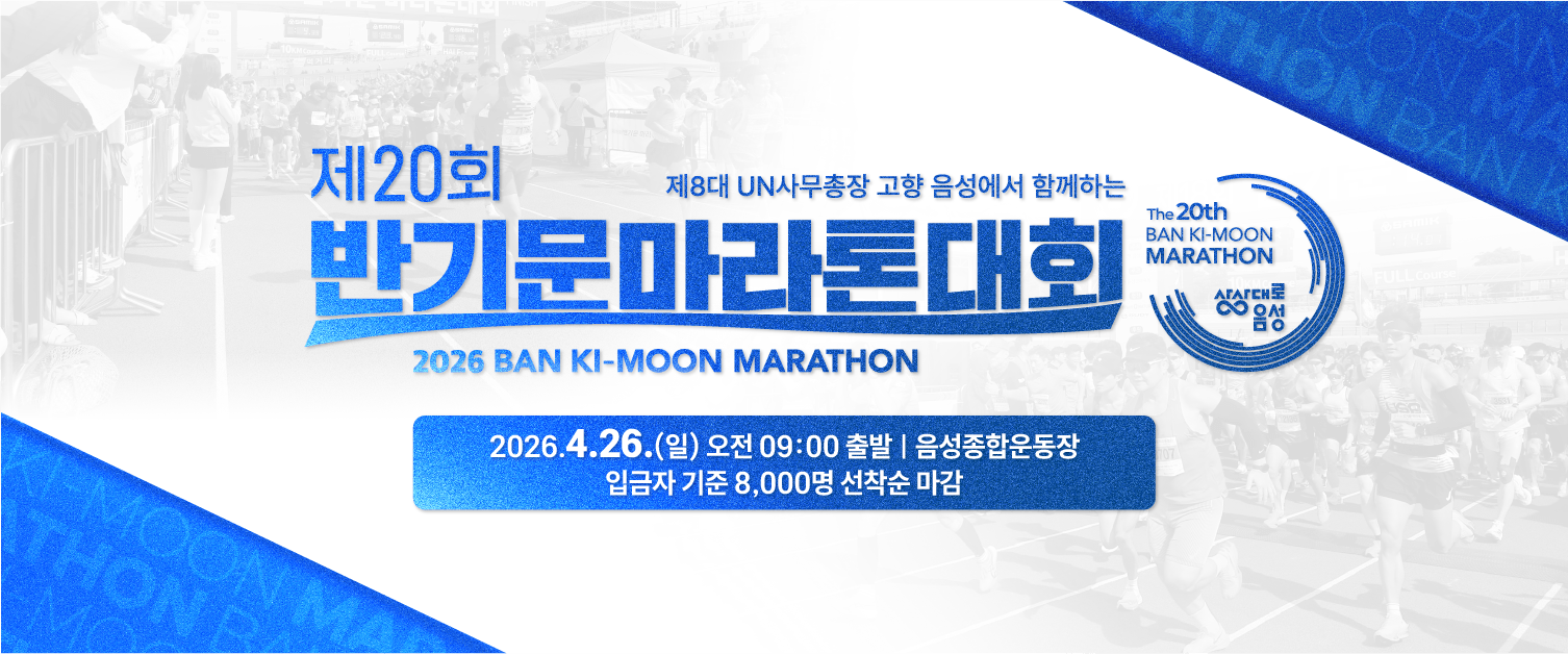 ■ 대회명 : 제20회 반기문마라톤대회 ■ 대회일정 : 2026년 4월 26일 (일) ■ 장소 : 충청북도 음성군 음성읍 설성로 47 음성종합운동장 ■ 대회코스 : FULL, HA…