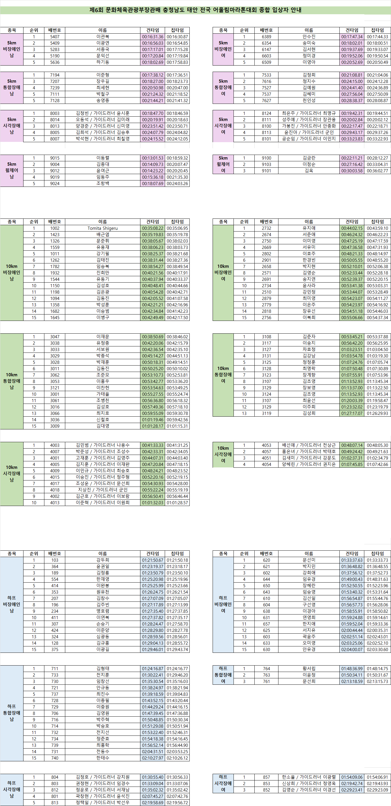 [종합 입상자] 제6회 문화체육관광부장관배 충청남도 태안 전국어울림마라톤대회 종합 시상 입상자 안내