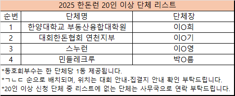 20인 이상 단체 중 리스트에 없는 단체는 사무국으로 연락 부탁드립니다.